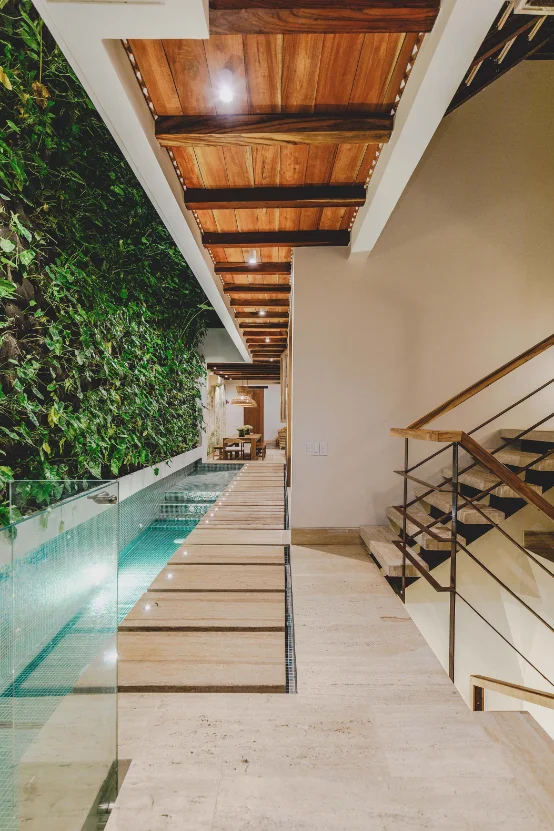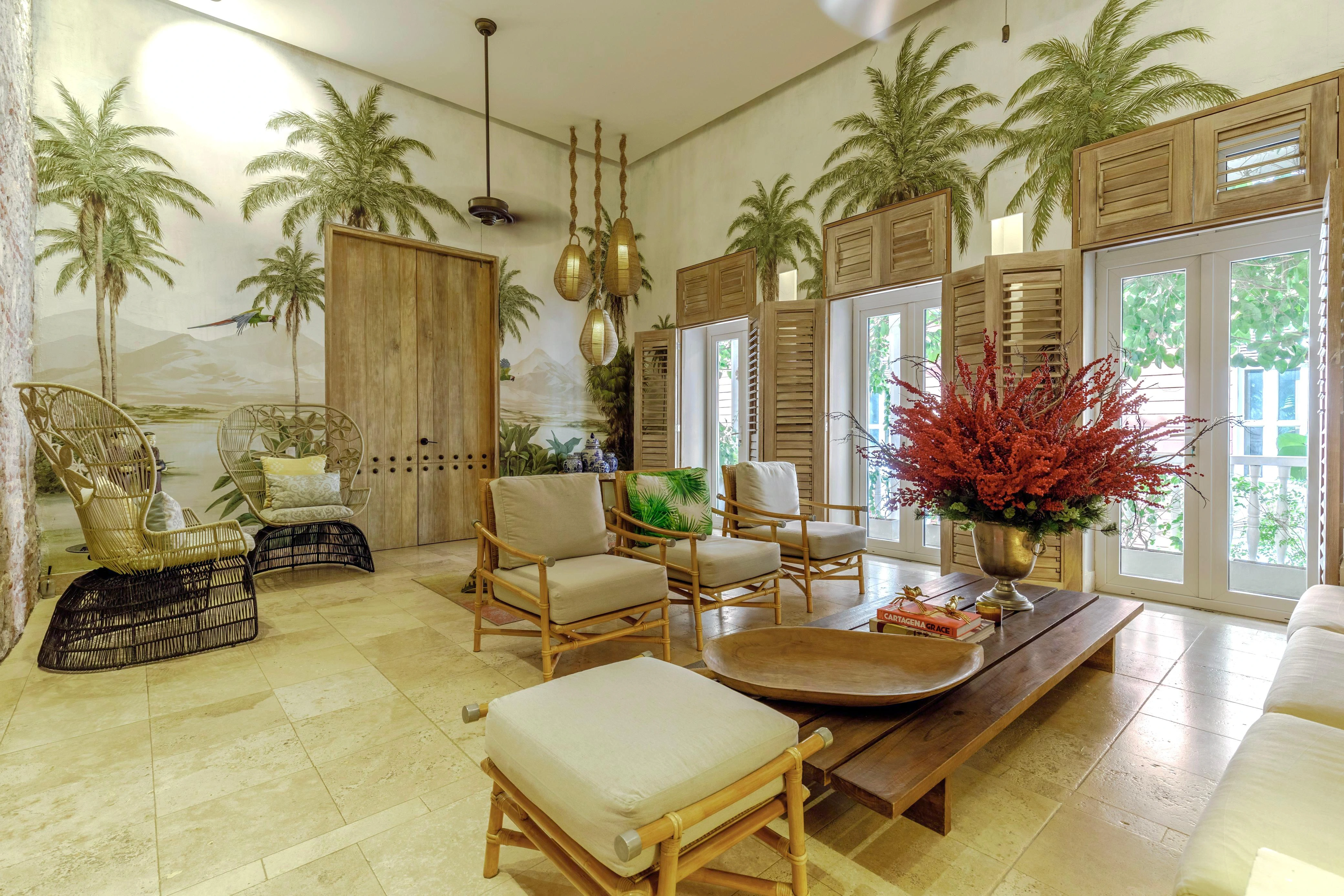 A seventeenth-century colonial casa where exposed coral stone walls meet vibrant contemporary furnishings. Hand-painted palm murals cascade across double-height walls, while original timber shutters filter Caribbean light through every room.